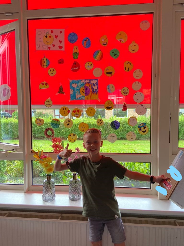 Het jongetje hieronder bijvoorbeeld kwam bij mij in de eerste week met een tekening waarop emoji's stonden. Ik zei dat ik het een mooie tekening vond en vroeg of ik hem op mocht hangen. Dit wilde hij graag. 'Juf, mag ik er dan een hele emoji muur van maken?' Tuurlijk mocht dat. Hij spoorde de rest van de klas aan en binnen 2 dagen hing het hele raam vol. Gezellig voor in de klas en goed voor de groepssfeer. :)