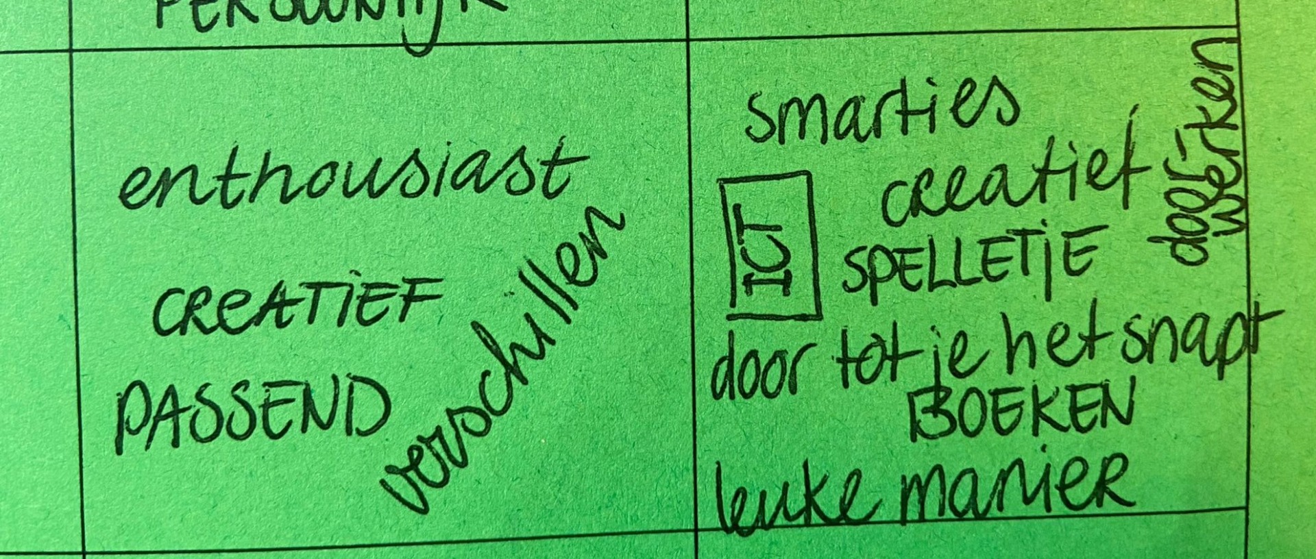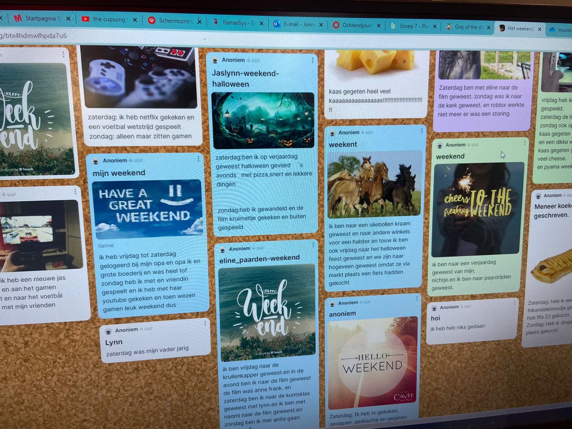 Hiernaast staat een voorbeeld van hoe ik ICT nog meer gebruik, namelijk met Padlet. De kinderen kunnen op hun eigen apparaat invullen wat ze in het weekend hebben gedaan en dit zien we terug op het grote bord. Aan de hand daarvan bespreken we het afgelopen weekend.